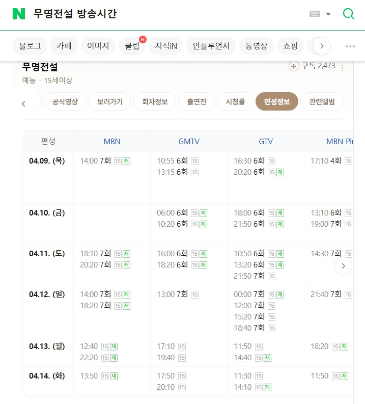 - MBN 채널 기준 4월 9일부터 4월 14일까지 집중 편성