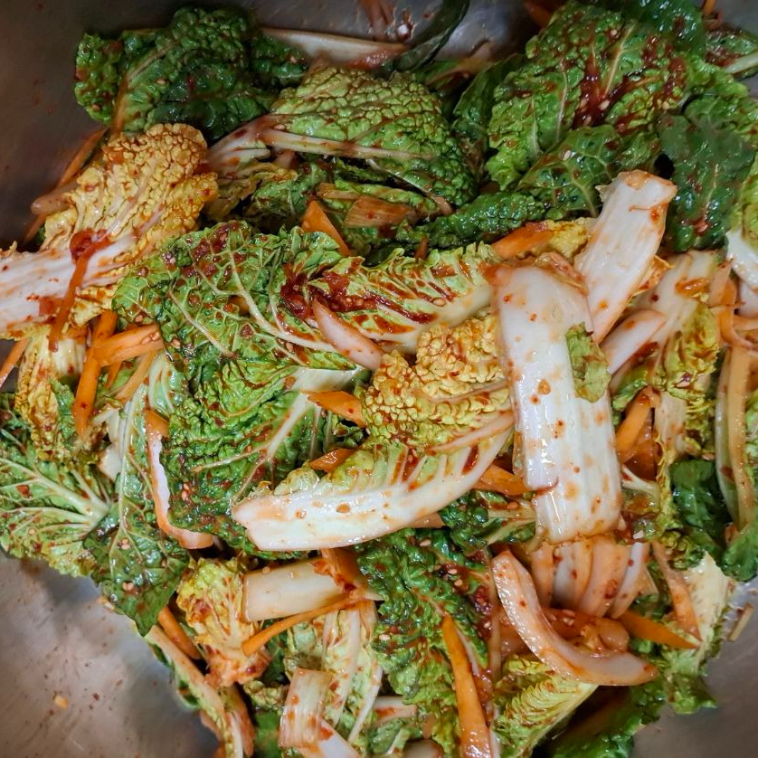 - 봄동 겉절이를 올리고, 남겨둔 양념이 있으면 1큰술만 추가