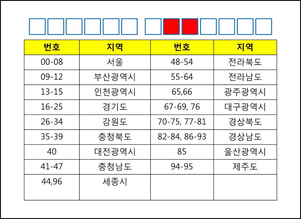 이 범위만 확인해도 주민번호 뒷자리 앞의 두 자리 숫자를 통해 어느 광역단체에서 출생신고가 이루어졌는지 대략적으로 파악할 수 있습니다.